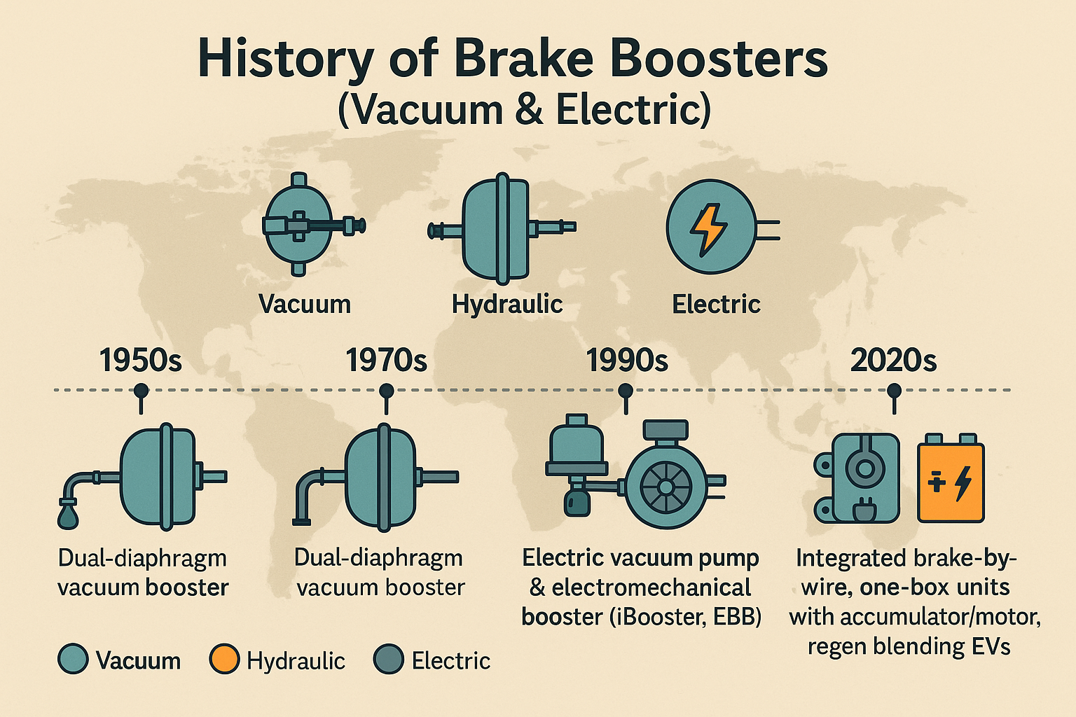 브레이크 부스터는 페달 힘을 증폭해 드라이버 입력(발)을 유압 압력으로 효율적으로 바꾸는 장치입니다. 초창기 진공 다이어프램에 의존하던 시대에서, 고부하 디젤/트럭의 하이드로부스트, 터보·스톱/스타트·HEV/EV 시대의 전동식(Electric Brake Booster)·브레이크-바이-와이어(BBW)로 진화했습니다. 오늘은 AEB/ACC 같은 ADAS와 재생제동 블렌딩을 위해 빠른 압력 구축·정밀 제어·이중화가 필수입니다. 이 글은 역사→구조/동작→진단/정비→미래 로드맵을 정리한 글 입니다.