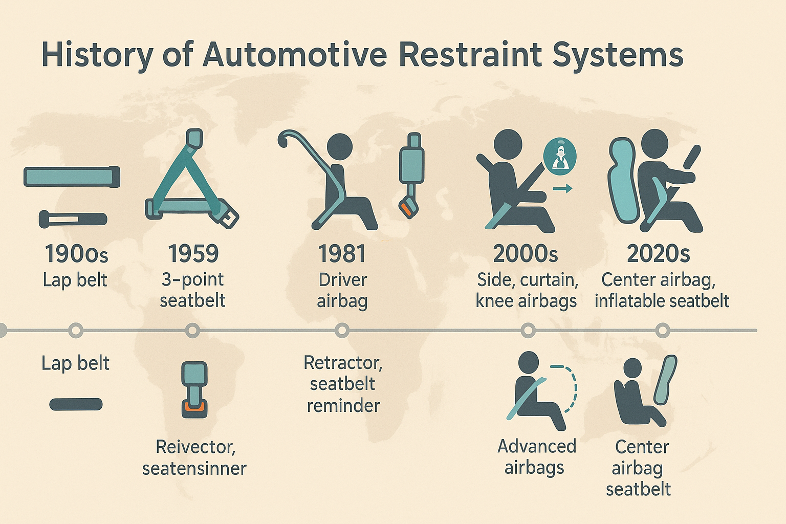 초기의 2점식 랩 벨트는 하복부 손상 위험이 컸고, 1959년 3점식 벨트가 등장해 흉부·골반을 함께 구속하면서 표준이 되었습니다. 이후 리트랙터와 자동 조절식 앵커로 착용 편의성이 개선됐습니다.