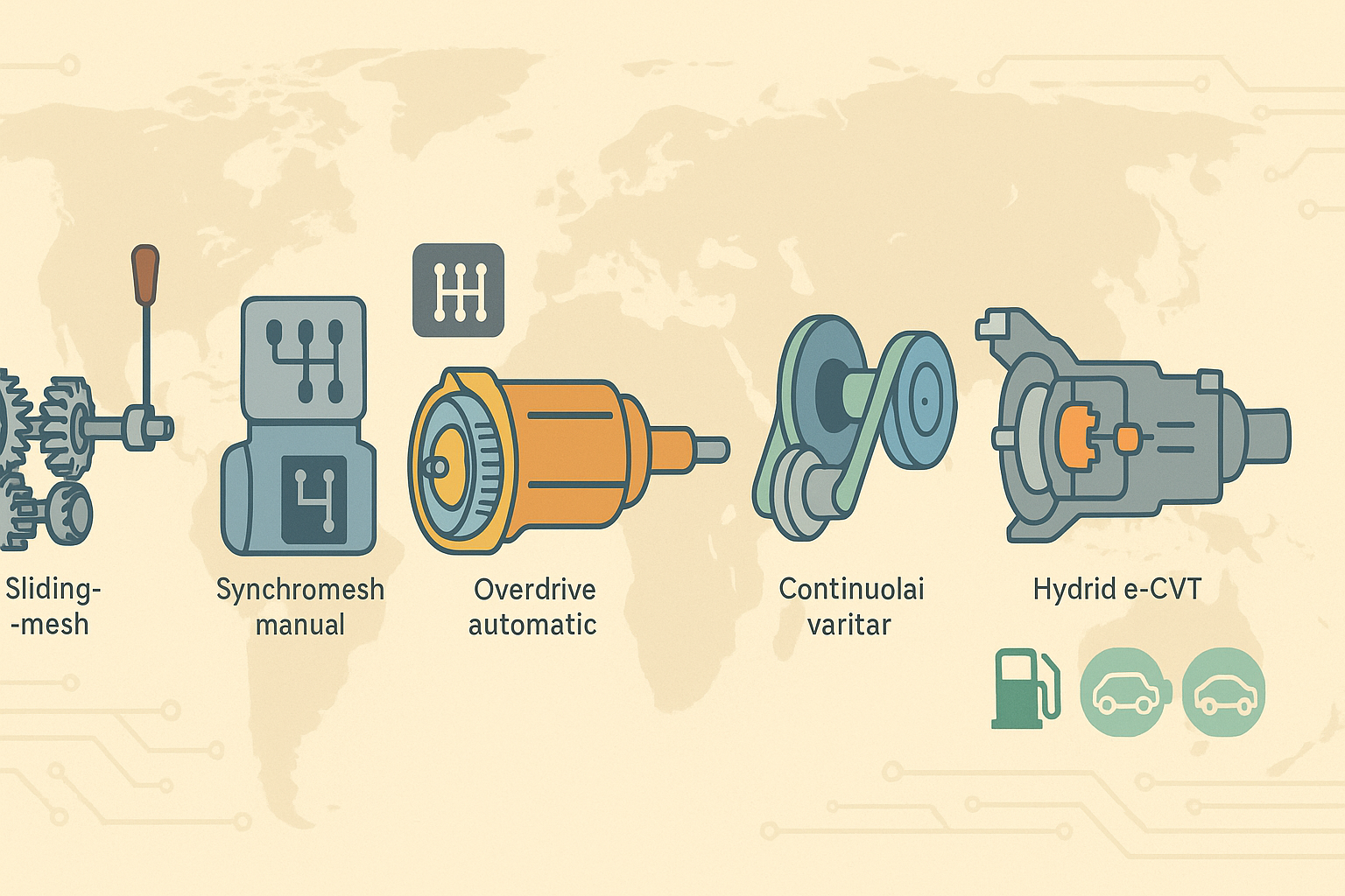 달리는 차에서 ‘엔진/모터 힘을 바퀴에 어떻게 전달할까’는 성능·연비·정숙성·내구를 동시에 좌우하는 핵심 변수입니다. 인력으로 기어를 바꾸던 수동 변속기에서 시작해, 유성기어와 토크컨버터 자동변속기(AT), 벨트/체인을 쓰는 무단변속기(CVT), 듀얼클러치(DCT), 액추에이터가 수동을 대신하는 AMT, 그리고 모터와 유성기어를 엮은 e-CVT·파워스플릿 하이브리드까지—변속기의 역사는 ‘기계식 제어→전자제어→소프트웨어 정의’로 진화해 왔습니다. 전기차 시대에 들어 많은 모델이 단일 감속기만 쓰지만, 고속 효율·견인/상용 영역에서는 2단 이상 다단 EV 기어박스와 통합 e-액슬이 확산 중입니다. 이 글은 변속기의 탄생부터 현재, 그리고 예측 기반 변속·디지털 트윈·e-액슬 통합 아키텍처로 향하는 미래를 연대기와 사용 시나리오별로 정리했습니다.